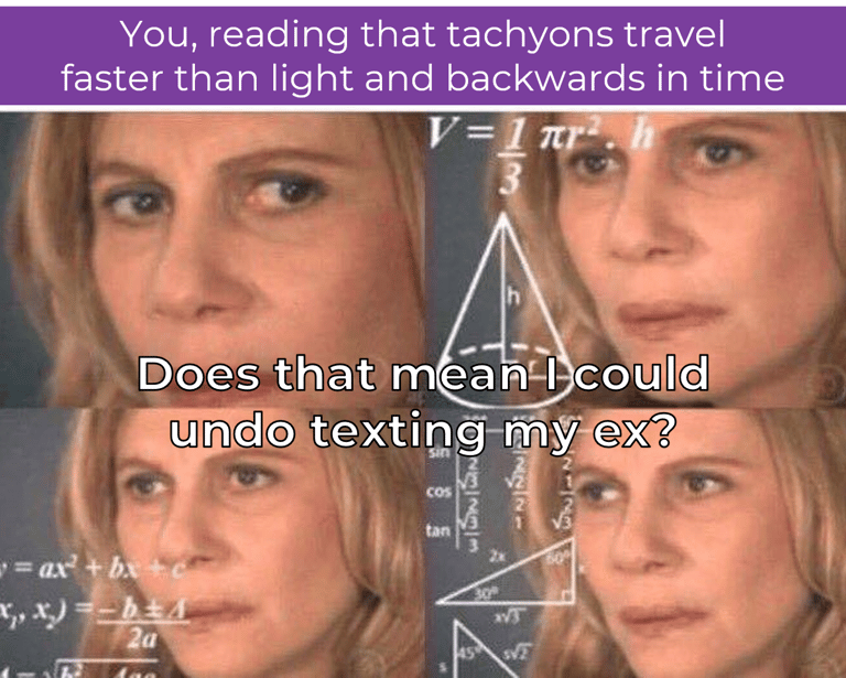 Since childhood we’ve been told nothing travels faster than light. That time only moves in one direction. That the past is the past and that's it… that's it, that's it, that's it, huh! 🎧🎶 Well… tachyons basically spit on that and say: “LOL, cute laws.”