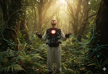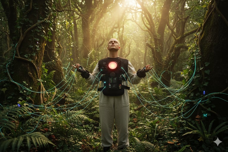 É uma combinação de colete e luvas com sensores hápticos que traduzem em vibrações o que a natureza está sentindo: umidade, temperatura, estresse das plantas, movimento de insetos e muito mais. Em vez de olhar para dados frios em uma tela, seu corpo se torna a interface. Você literalmente sente o que a floresta sente. Em outras palavras: o GAIA não mostra gráficos — ele traduz em sensações. É a linguagem emocional da Terra… só que com Bluetooth.